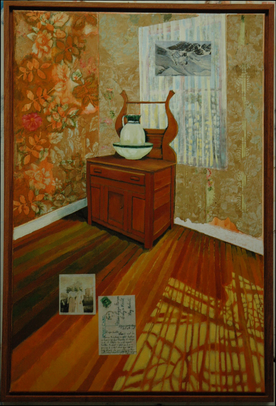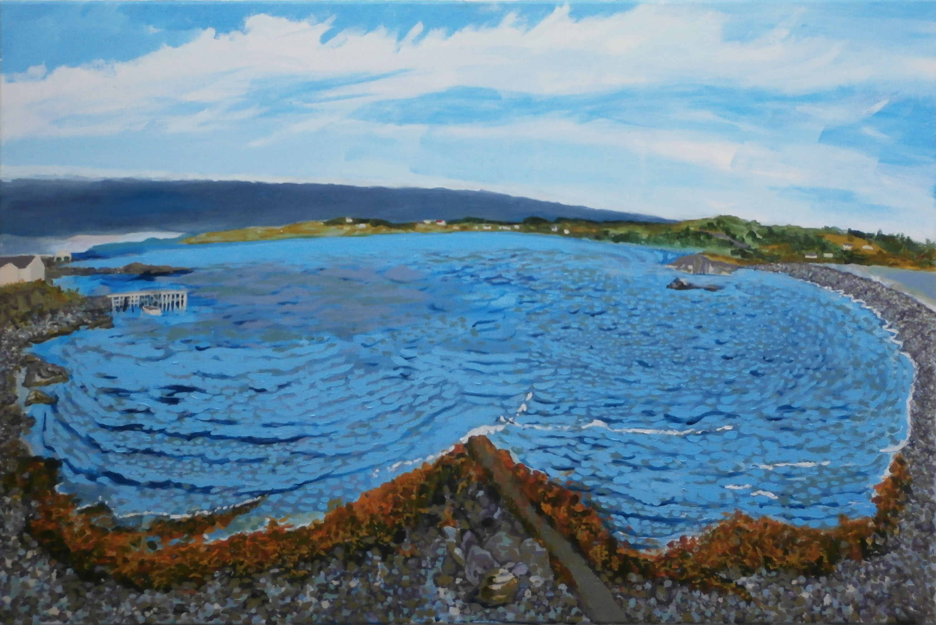 “Painting” was my emphasis when I studied art at Andrews University in the 1980’s. At that time I was an Abstract Expressionist–no surprise there, so was everyone else. After a decade focused on printmaking, when I returned to painting I found that printmaking had influenced my technique. I’ve enjoyed playing with stencils, texture, and collage elements. I have also been indulging my inner landscape artist. Although my youthful inner artist was angt ridden, I’m very happy when I paint outdoors. Unfortunately, it takes me longer to paint then to produce a suite of prints, so my paintings are rarer. The featured image on this page (which I can’t seem to caption) is an acrylic board sketch that I painted in 1996 just as a rain storm was starting on the hill in Coley’s Point South, behind our family house. I’m very fond of it, so it’s not for sale, but I keep saying I need to do a larger version. And lately I’ve been working on a painting series based on Newfoundland stamps–but actually inspired by Traffic Box art (see my Visual Blog: Barmp if You Like Art).